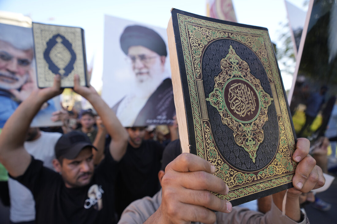 Iraqis raise copies of the Quran, Muslims' holy book, during a protest in Baghdad, Saturday. Hundreds of protesters attempted to storm Baghdad's heavily fortified Green Zone, which houses foreign embassies and the seat of Iraq's government, following reports of the burning of a Quran by a ultranationalist group in front of the Iraqi Embassy in Copenhagen.